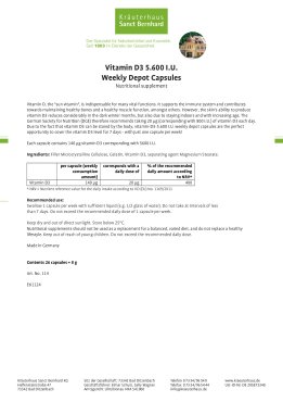 Vitamin D hỗ trợ hệ thống miễn dịch và góp phần duy trì xương khớp khỏe mạnh. Trái ngược với các vitamin khác, cơ thể con người có thể tự sản xuất vitamin D khi tiếp xúc với ánh nắng mặt trời. Tuy nhiên, khả năng sản xuất vitamin D của da giảm đáng kể trong những tháng ngày mùa đông hay đối với những người cao tuổi. Hiệp hội Dinh Dưỡng Đức (DGE) khuyên bạn nên uống 20 mcg (tương ứng với 800 IU) vitamin D mỗi ngày. Do thực tế là vitamin D có thể được lưu trữ trong cơ thể vì vậy sản phẩm Viên nang bổ sung Vitamin D 5600 IU Weekly Depot Capsul là cơ hội hoàn hảo để sử dụng vitamin D trong vòng 7 ngày - chỉ với một viên mỗi tuần! Do được bào chế dưới dạng liều cao nên Vitamin D3 sẽ được dự trữ trong các mô, sau đó sẽ giải phóng dần theo nhu cầu của cơ thể. Sản phẩm đã được kiểm nghiệm, cam kết 100% hàng chính hãng thương hiệu Sanct Bernhard của Đức